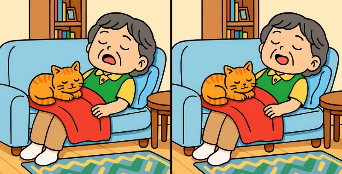 Gotowy do sprawdzenia się? Oto dwie ilustracje: przedstawiają kobietę i kota śpiących na kanapie. Na pierwszy rzut oka sceny wyglądają dokładnie tak samo, ale są między nimi trzy małe różnice.