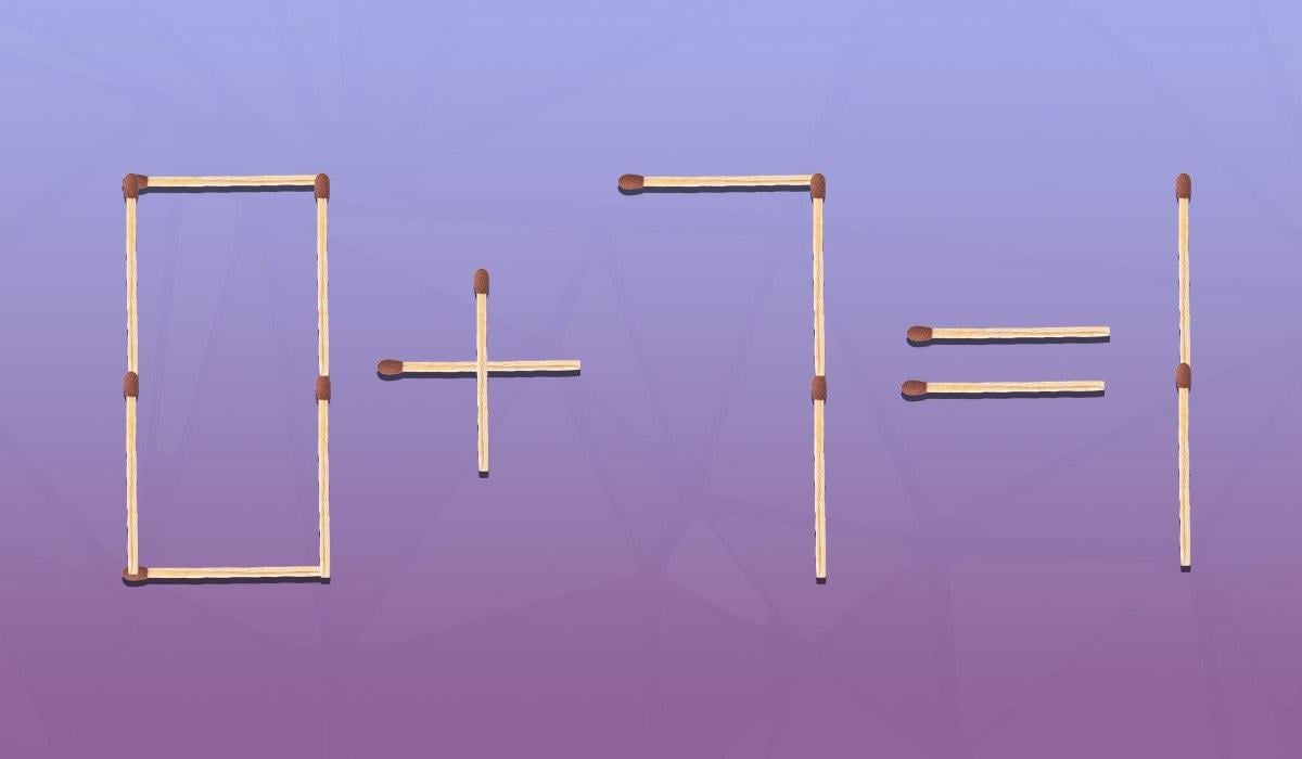 Poniżej znajduje się obrazek, na którym równość 0+7=1 jest ułożona za pomocą zapałek. Oczywiście jest tu błąd. Twoim zadaniem jest poprawienie równości poprzez wprowadzenie niewielkiej zmiany.