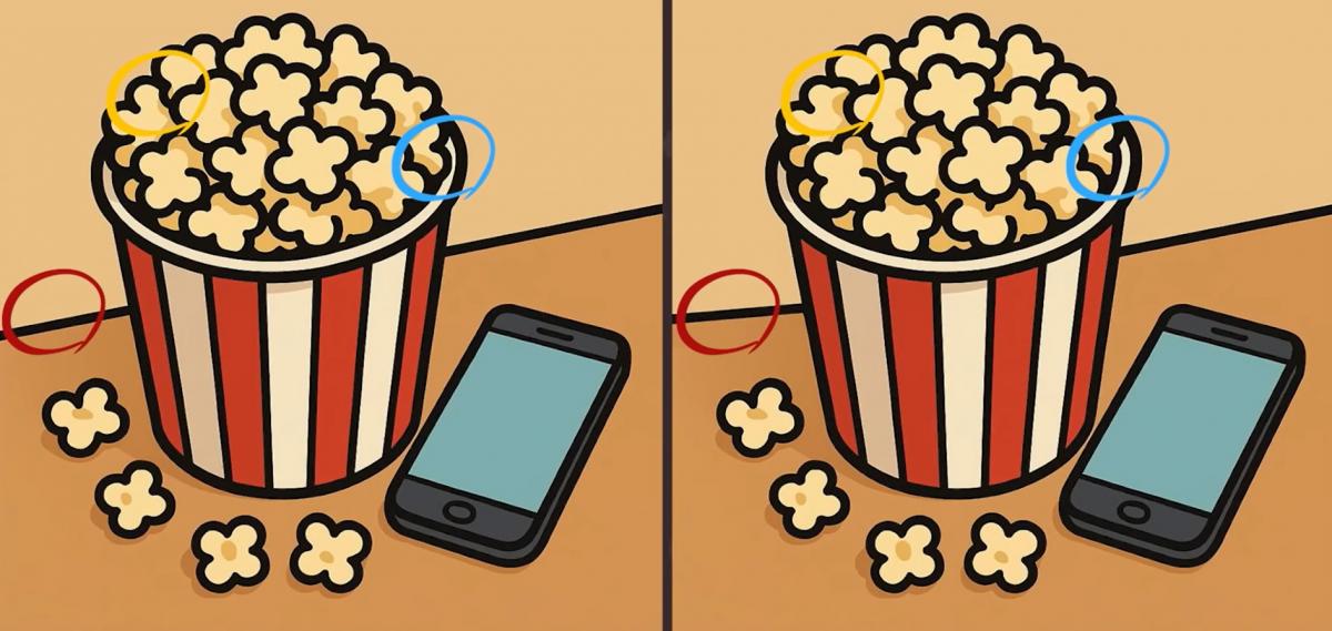 Przed tobą znajdują się dwa zdjęcia wiadra popcornu. Na pierwszy rzut oka obrazy są całkowicie identyczne, ale to tylko złudzenie. Istnieją między nimi trzy małe różnice.