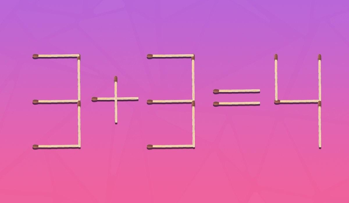 Poniżej znajduje się obrazek, na którym równość 3+3=4 jest ułożona z zapałek. Z matematycznego punktu widzenia jest to nieprawidłowe, ponieważ odpowiedzią powinno być sześć.