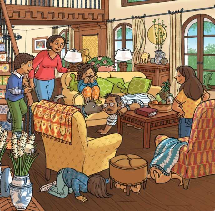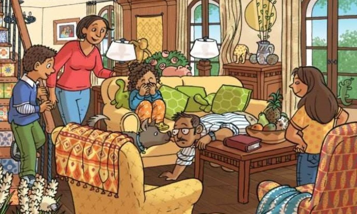 Na obrazku widzimy rodzinę, która coś zgubiła i teraz próbuje to odnaleźć. Zagubione przedmioty to pędzel i szczotka. Tata, mama i ich dzieci bezskutecznie próbują odnaleźć zagubione przedmioty, ale jeszcze im się to nie udało. Musisz pomóc rodzinie w poszukiwaniach.