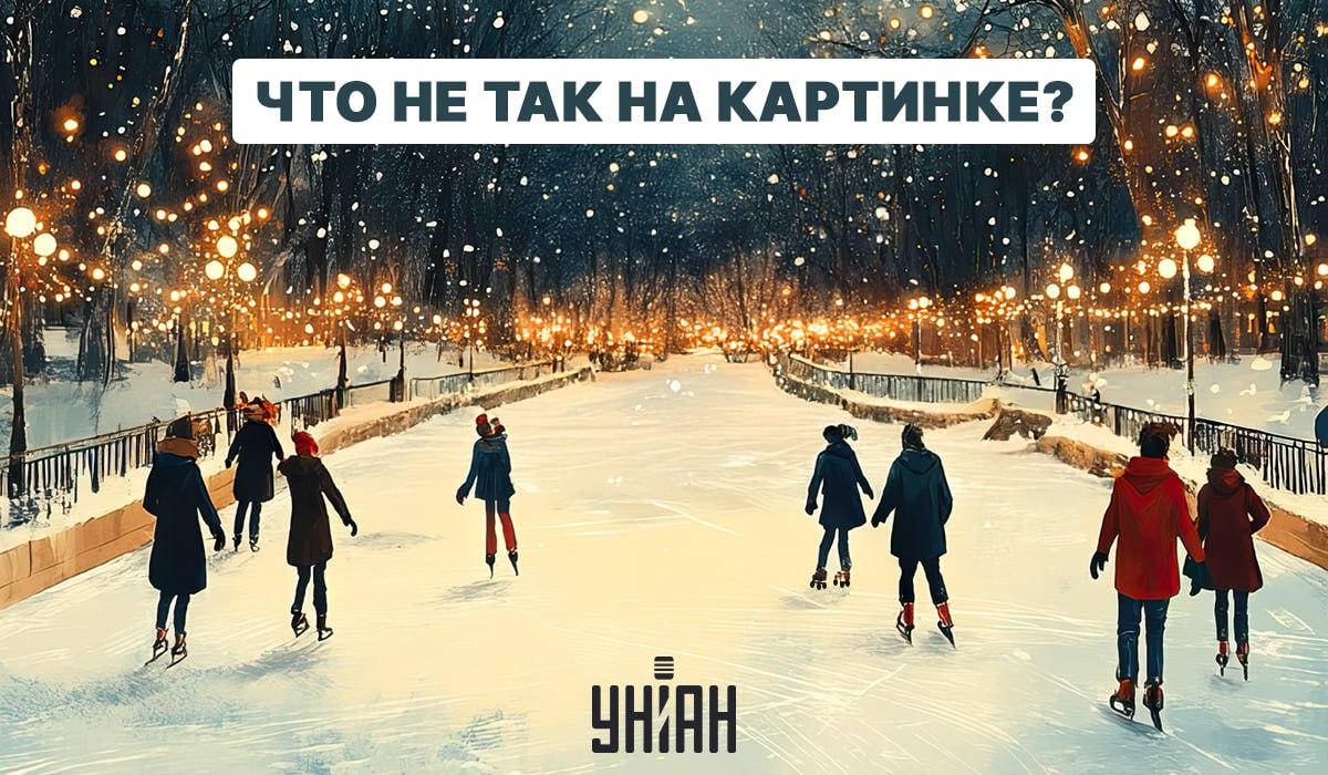 Przed tobą znajduje się zdjęcie przedstawiające lodowisko z gośćmi. Piękny krajobraz w zimowej scenerii na pierwszy rzut oka wydaje się idealny. W rzeczywistości jednak kryje się w nim poważny błąd.