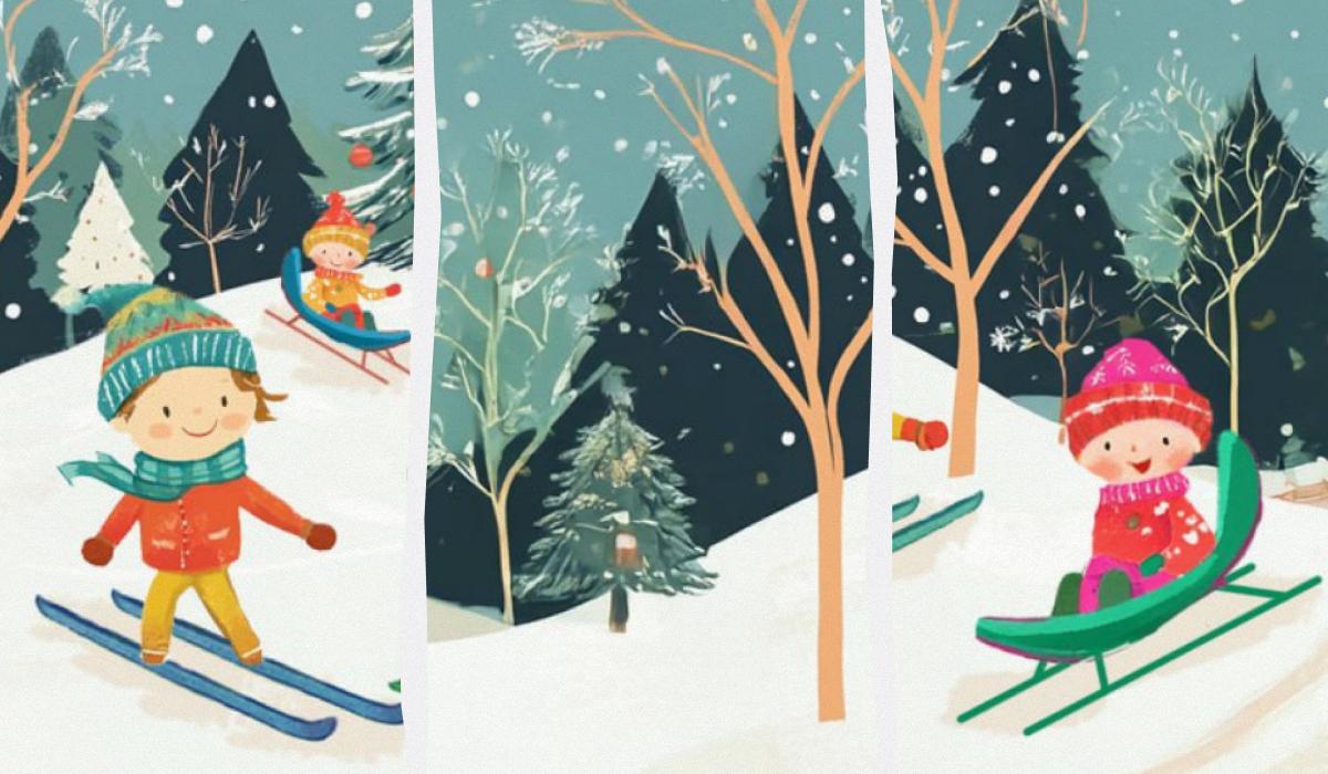 Przed tobą jest grupa szczęśliwych dzieci cieszących się śniegiem i prawdziwą zimową pogodą w lesie. Maluchy zjeżdżają na sankach, a ich starsi koledzy jeżdżą na nartach.