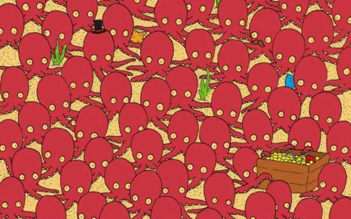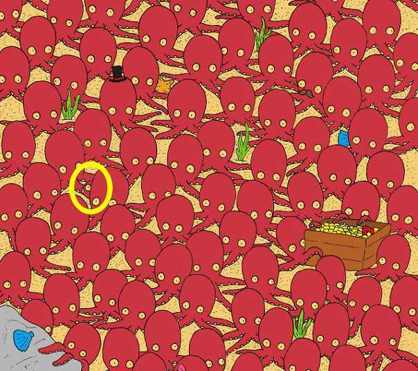 Spróbuj rozwiązać trudne, ale zabawne złudzenie optyczne – ryba wśród ośmiornic jest dość dobrze ukryta, a ty nadal musisz spróbować ją znaleźć.